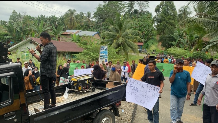 Melalui unras itu, sebanyak 200 orang masyarakat setempat menyentil terkait dugaan penyalahgunaan Dana Desa (DD) tahun 2022 – 2023, dan pemberhentian sepihak perangkat Desa.