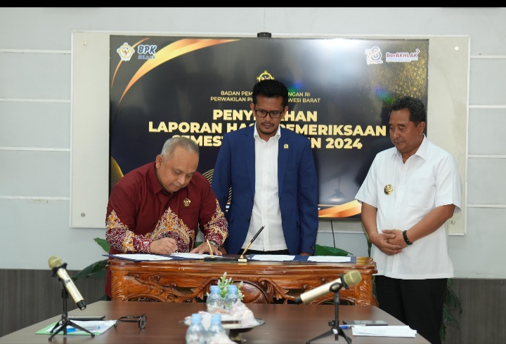 GlobalSulbar.com, Mamuju – PJ Gubernur Sulawesi Barat, Bahtiar Baharuddin menerima Laporan Hasil Pemeriksaan (LHP) Badan Pemeriksaan Keuangan (BPK) terhadap kinerja penanganan kebencanaan dari tahun 2023 hingga triwulan III 2024.