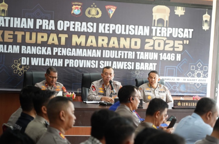 GlobalSulbar.com, Mamuju – Guna mengamankan masa mudik lebaran hari raya Idul fitri 1446 H, Kepala Kepolisian daerah Sulawesi barat Irjen Pol Adang Ginanjar secara resmi membuka kegiatan Latihan Pra Operasi Kepolisian Terpusat dengan sandi “Ketupat Marano 2025”, di Aula Ditreskrimsus Polda Sulbar, Selasa 18 Maret 2025.
