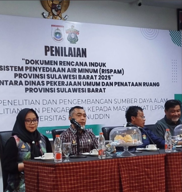 GlobalSulbar.com, Mamuju – Dinas Pekerjaan Umum dan Penataan Ruang (PUPR) Provinsi Sulawesi Barat menggandeng LPPM Universitas Hasanuddin (Unhas) dalam menggelar kegiatan Penilaian Dokumen Rencana Induk Sistem Penyediaan Air Minum (RISPAM) Provinsi Sulawesi Barat Tahun 2025, di Grand Maleo Hotel & Convention Mamuju, Kamis 29 Januari 2026.