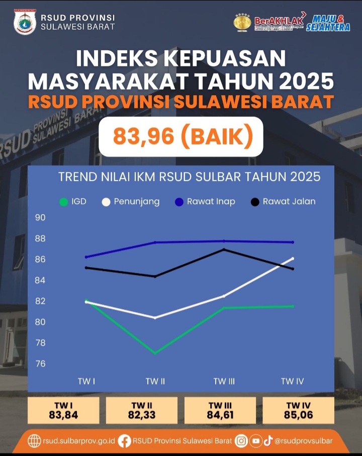 Hasil ini mencerminkan tingkat kepuasan masyarakat terhadap kualitas pelayanan kesehatan yang diberikan oleh rumah sakit milik Pemerintah Provinsi Sulawesi Barat tersebut sepanjang tahun 2025.