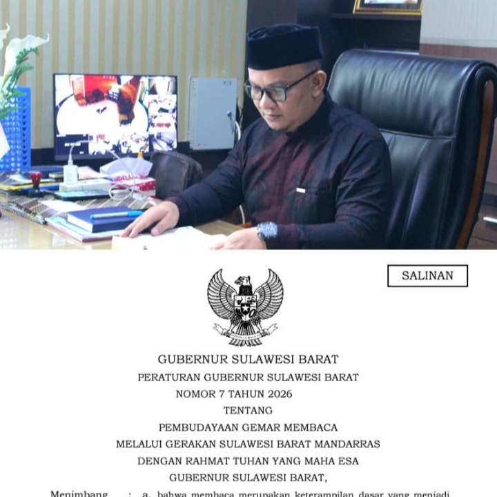 GlobalSulbar.com, Mamuju – Guna memperkuat budaya literasi, Pemerintah Provinsi Sulawesi Barat (Pemprov Sulbar) resmi menetapkan Peraturan Gubernur Sulawesi Barat Nomor 7 Tahun 2026 tentang Pembudayaan Gemar Membaca melalui Gerakan Sulawesi Barat Mandarras.